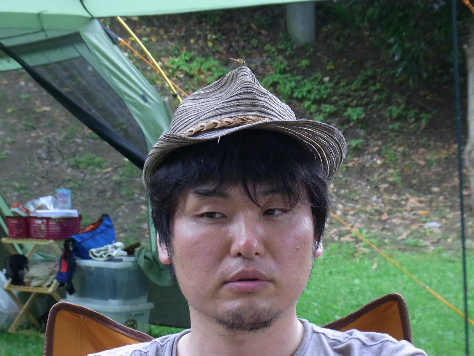 食べてるとトンボが頭の上に不時着
