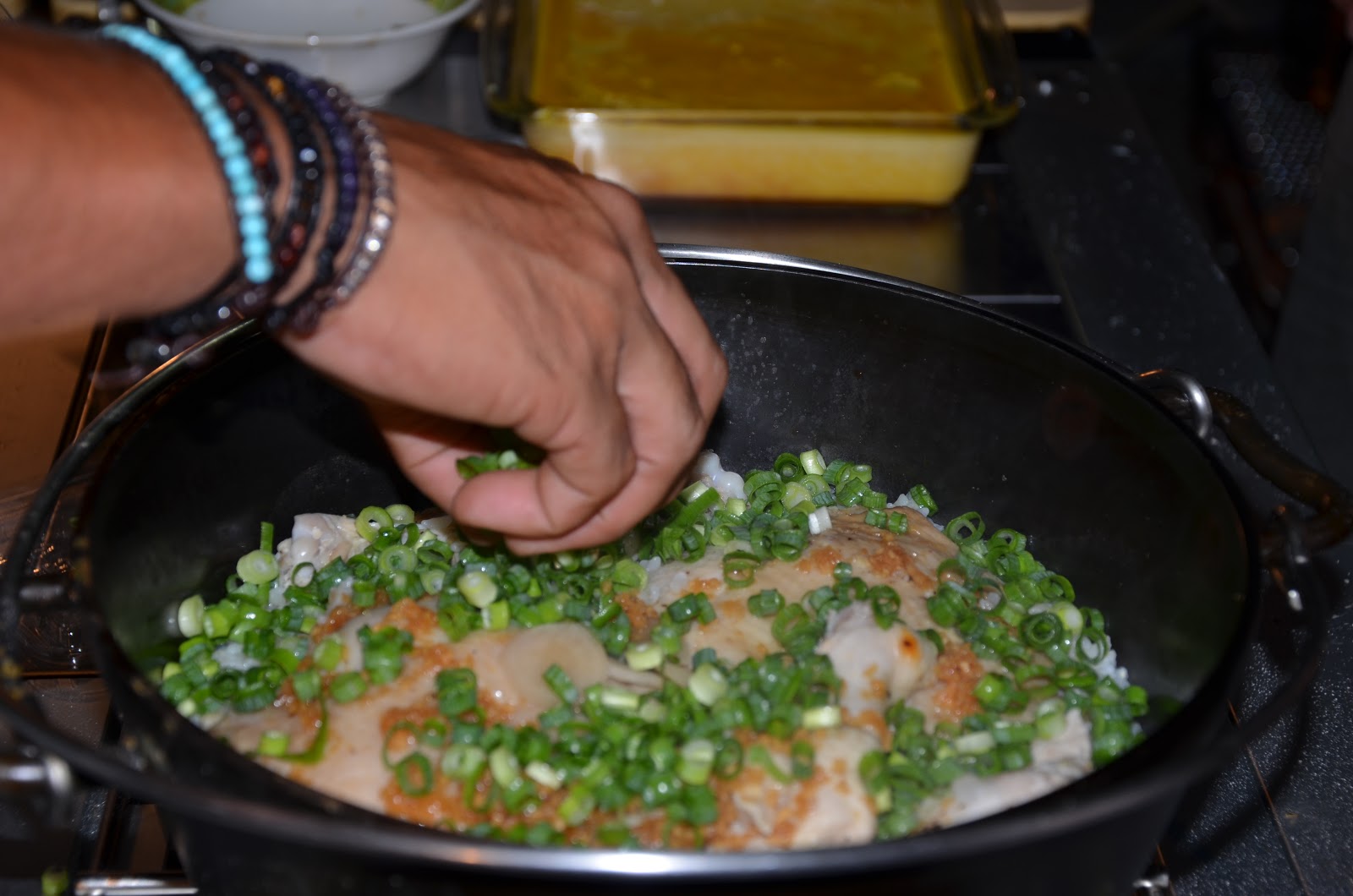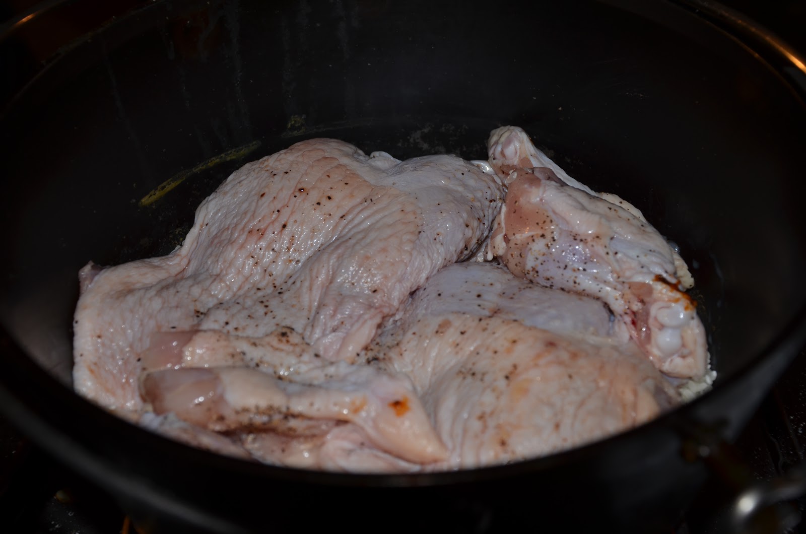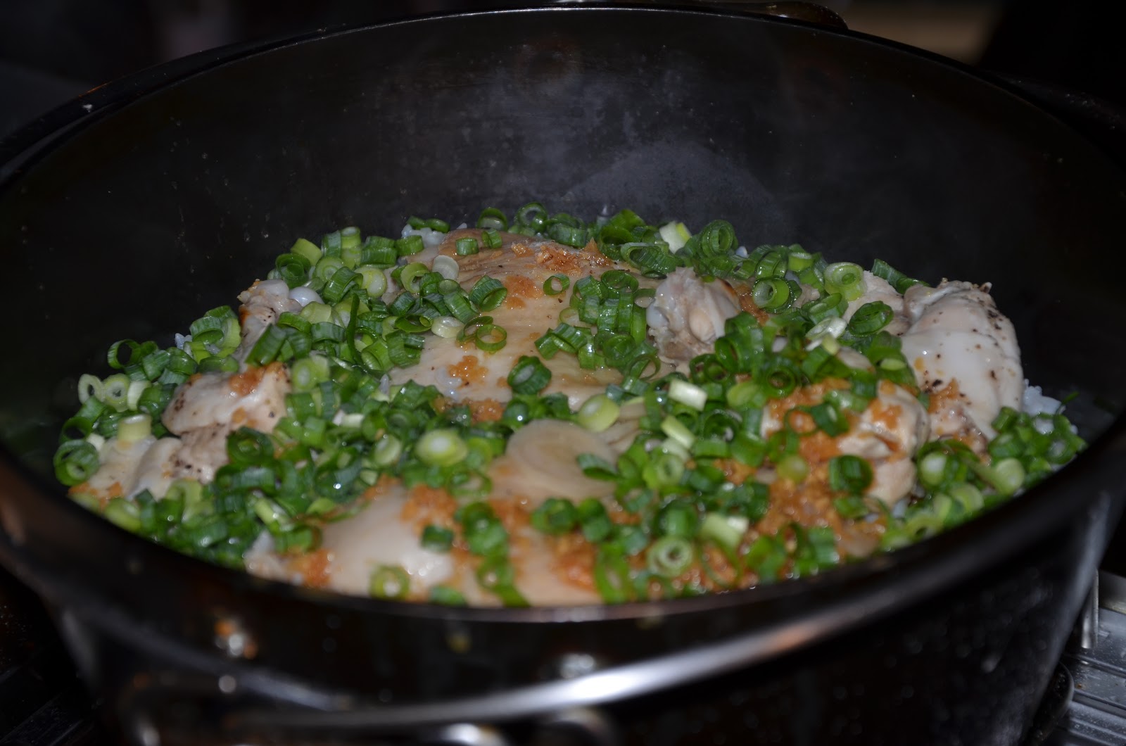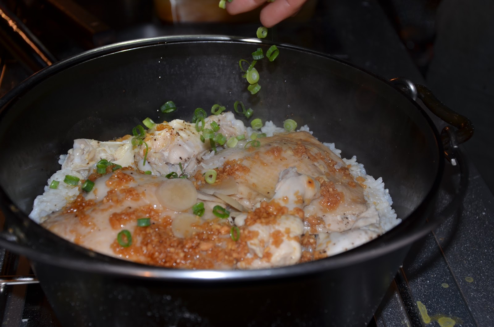 ダッチオーブンに敷き詰められたこの鶏のもも。