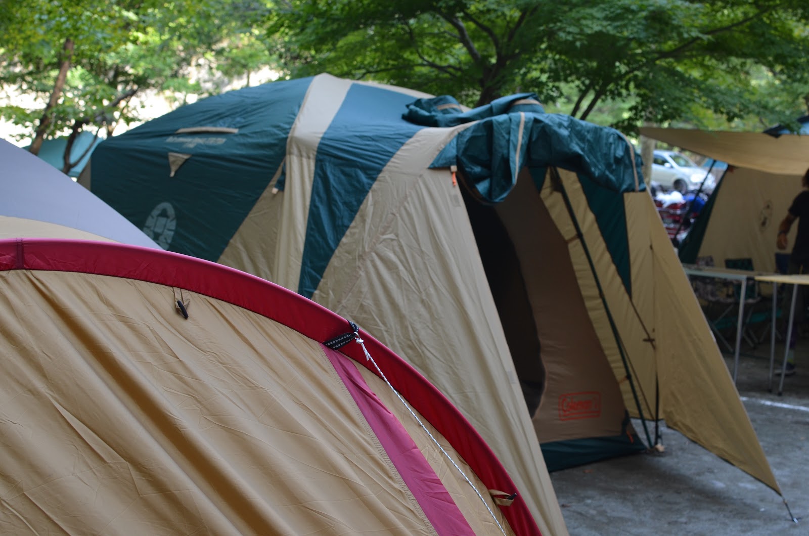 さて、イマキャンメンバーは川沿いではないのですが、広めな2区画をゲット!早速テント2張りとスクリーンテント1張りを設営開始!