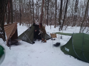 たかさんとやすさんは薪ストーブの設置。The雪中キャンプって感じするなあ!
